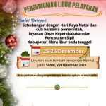 Sobat Dukcapil,Sehubungan dengan Hari Raya Natal dan cuti bersama pemerintah, layanan Dinas Kependudukan dan Pencatatan Sipil Kabupaten Blora libur pada tanggal 25–26 Desember 2025.🗓️ Layanan akan kembali beroperasi normal mulai Senin, 29 Desember 2025.Atas perhatian dan pengertiannya, kami ucapkan terima kasih.(Dindukcapil Kab Blora)